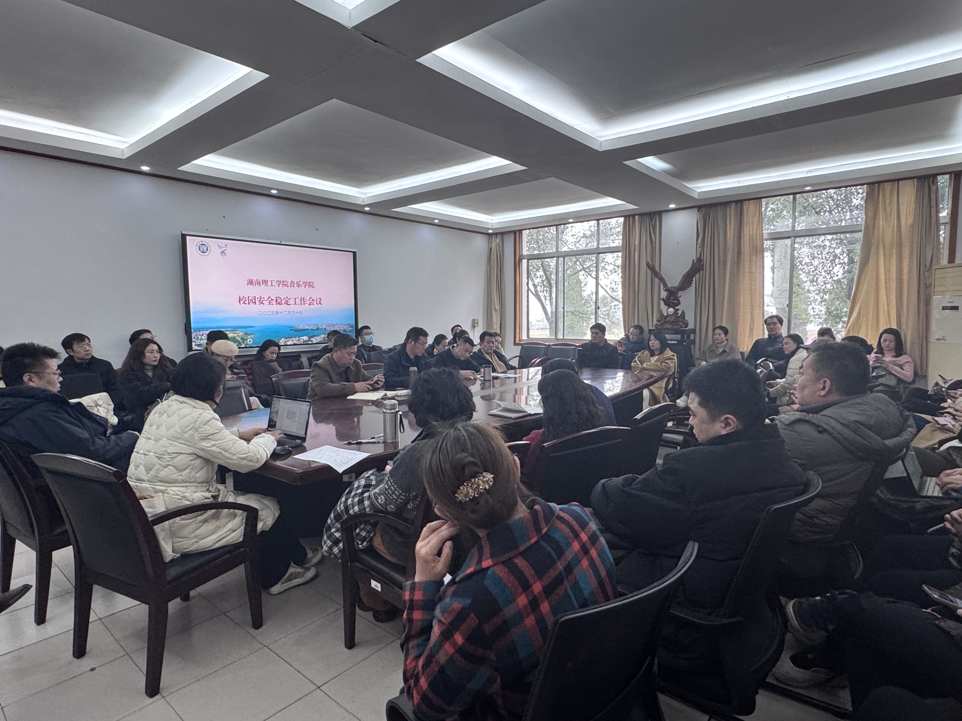 2025年12月30日下午,音乐学院召开2025年期末工作会议,全面部署学期末各项任务。会议由主持学院党委工作的副书记喻俊主持,主持学院行政工作的副院长庞毅传达了学校近期会议精神,副书记蔡奕、副院长刘栋梁、冯毅学院就分管的期末工作进行了安排布置。全体教师参加了会议。