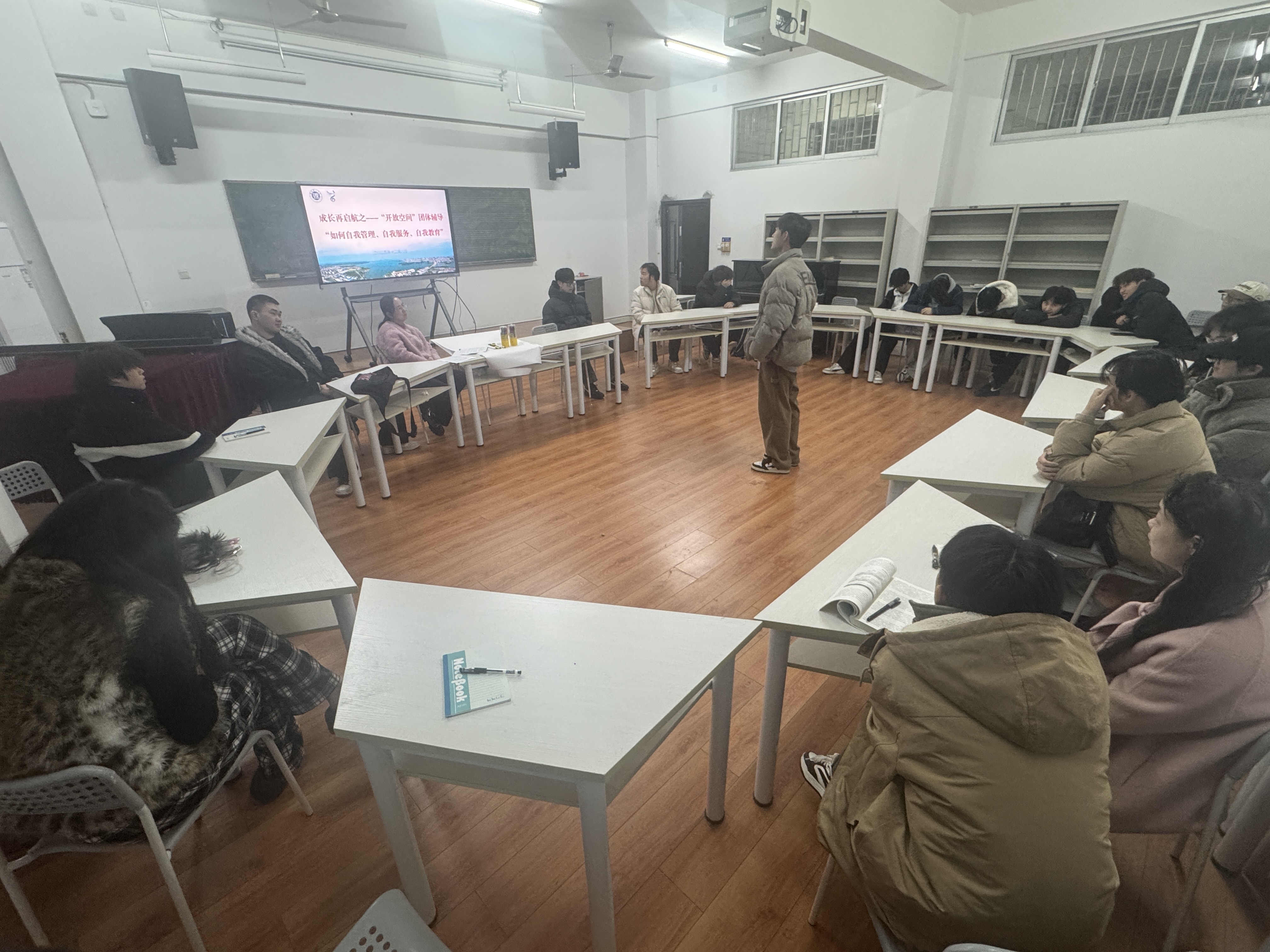 2025年12月8日晚,音乐学院“成长再启航”违纪学生教育专题培训第六讲在学院4202教室举行。本次培训创新形式,由学院党委副书记蔡奕主讲,以“开放空间”团体辅导形式呈现,围绕“如何自我管理、自我服务、自我教育”展开议题讨论深入互动。2025级辅导员孙征、2024级辅导员李亮菁、2023级辅导员胡程锦到场参与。