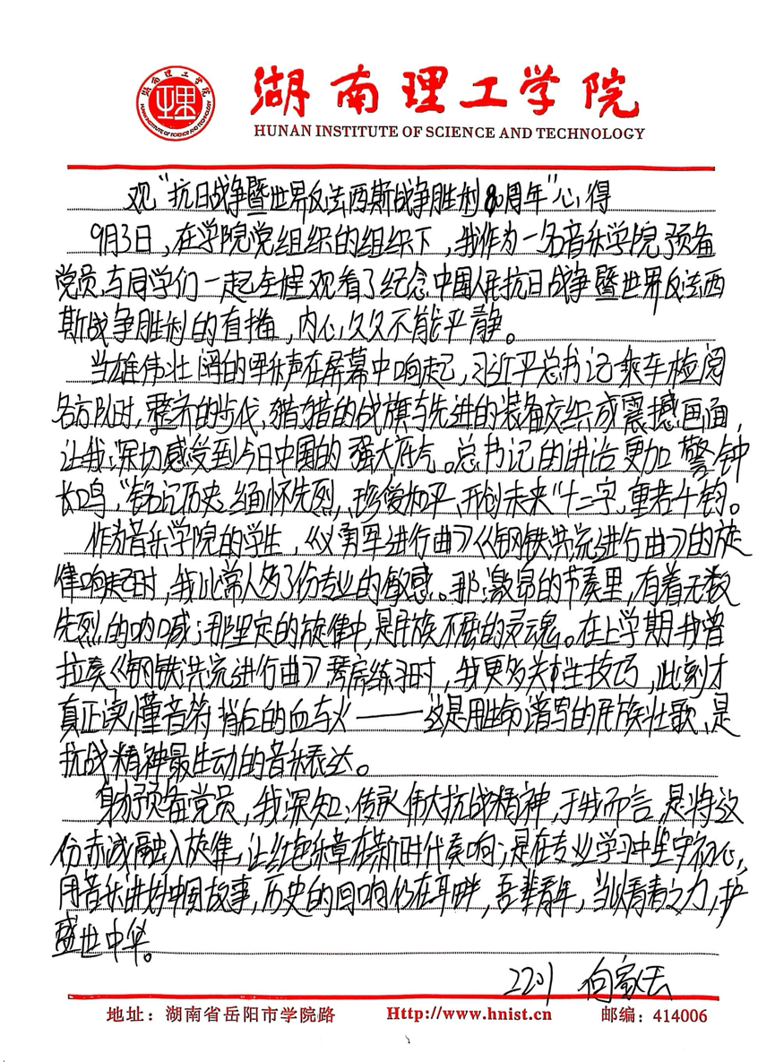 学生党员向家玉动情地说:“作为音乐学院学生,《义勇军进行曲》《钢铁洪流进行曲》的旋律让我读懂音符背后的血与火——这是用生命谱写的民族壮歌。身为预备党员,传承抗战精神于我而言,是将这份赤诚融入旋律,用音乐讲好中国故事”。