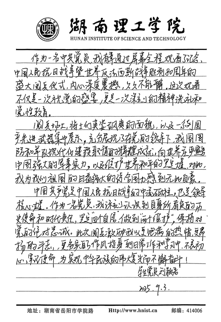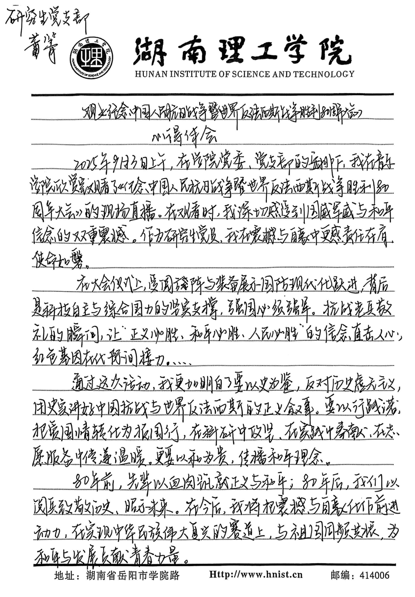 研究生党员董箐深切感受到:观看纪念大会直播,我深切感受到历史的厚重与和平的信念。抗战岁月昭示“正义必胜、和平必胜、人民必胜”的真理,让我倍感震撼与自豪,更觉责任在肩、使命如磐。我们要以史为鉴,反对历史虚无主义,将爱国情怀转化为扎实行动,在实践中攻坚克难、忠诚奉献、服务人民、传播和平,在民族复兴征程中贡献青春力量。
