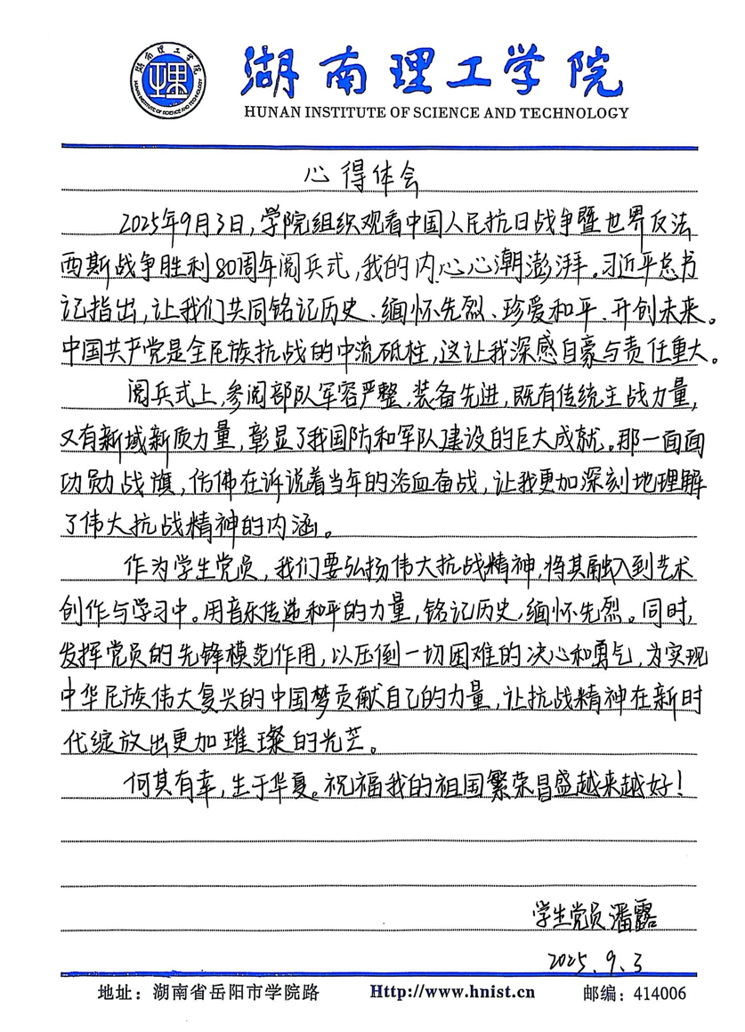 学生党员潘露表示:“要发挥党员先锋模范作用,将抗战精神融入艺术创作与学习,用音乐传递和平的力量,以压倒一切困难的决心,为实现中华民族伟大复兴的中国梦贡献自己的力量”。