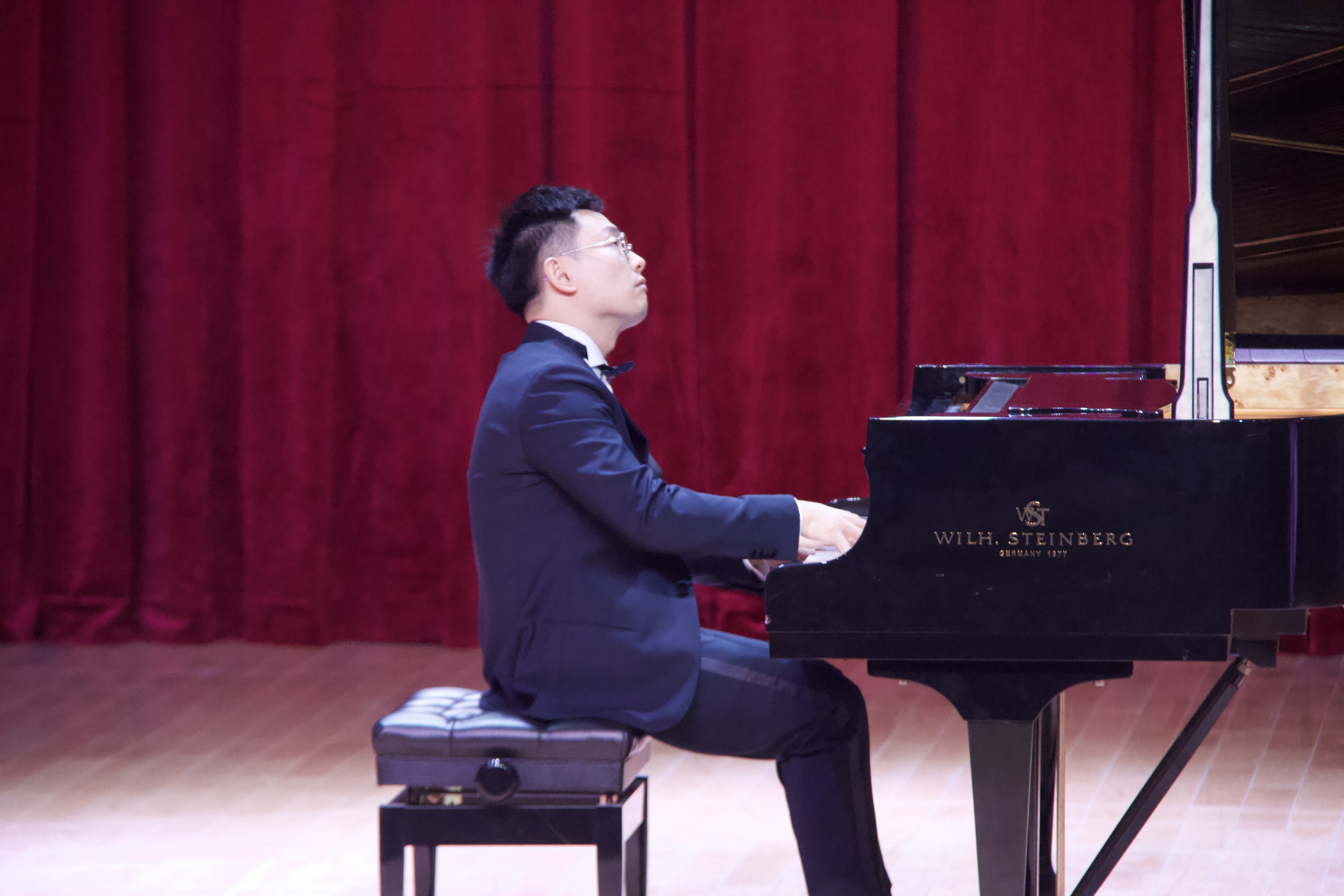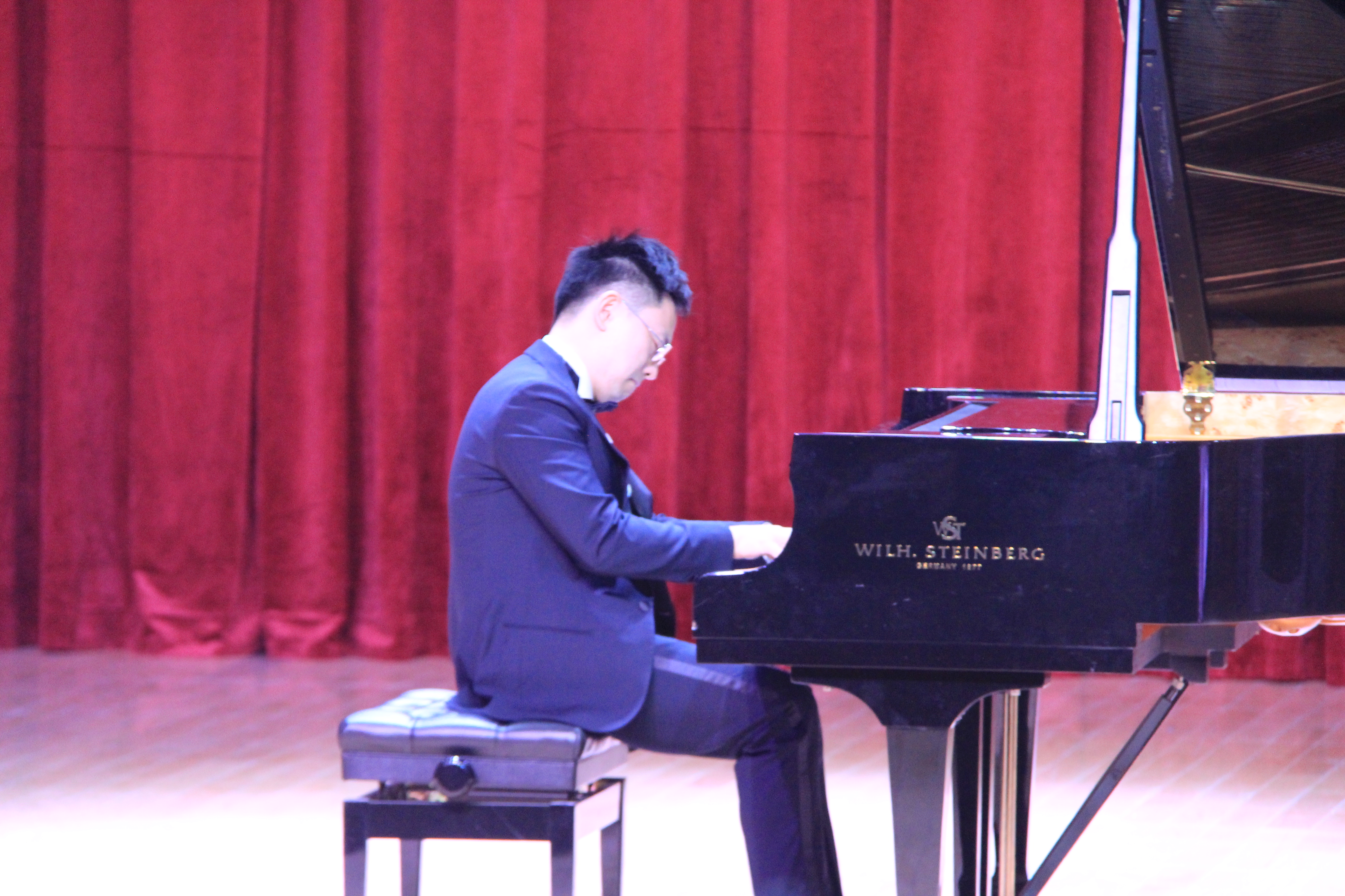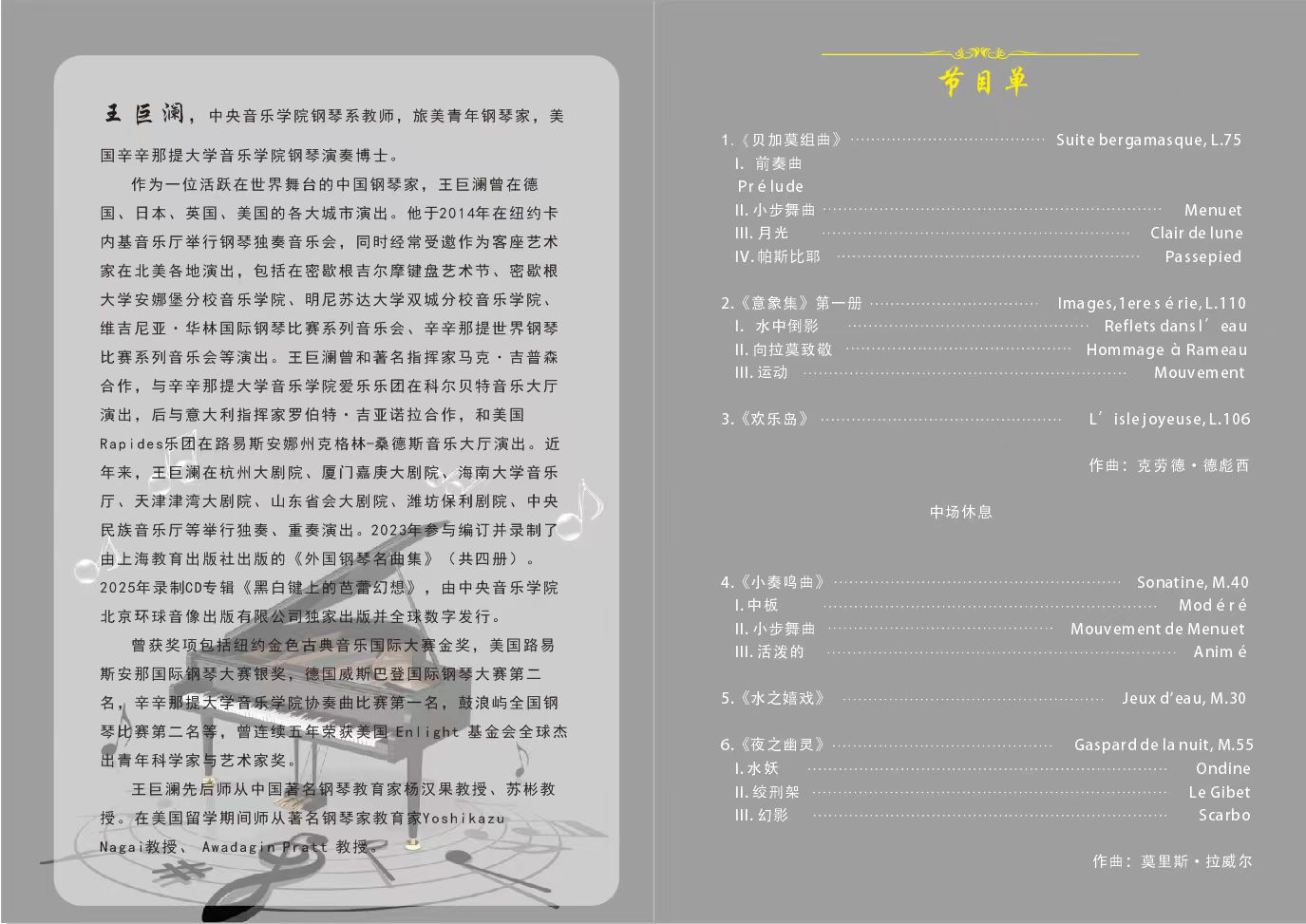 音乐会以“法国印象派钢琴作品精选”为核心主题,王巨澜博士带来多首德彪西与拉威尔的经典代表作。他先是完整演绎《贝加莫组曲》,从前奏曲的灵动、小步舞曲的典雅,到《月光》的静谧悠扬与帕斯比耶的明快节奏,层层递进展现印象派音乐的细腻张力;随后演奏《意象集》第一册,《水中倒影》的朦胧意境、《向拉莫致敬》的古典韵味与《运动》的活力韵律形成鲜明对比;《欢乐岛》的明快愉悦、《小奏鸣曲》三乐章的层次变化,以及《水之嬉戏》的灵动质感、《夜之幽灵》组曲中《水妖》的诡谲、《绞刑架》的沉郁与《幻影》的奇幻,均被其精准诠释,为现场听众呈现出丰富立体的听觉体验。