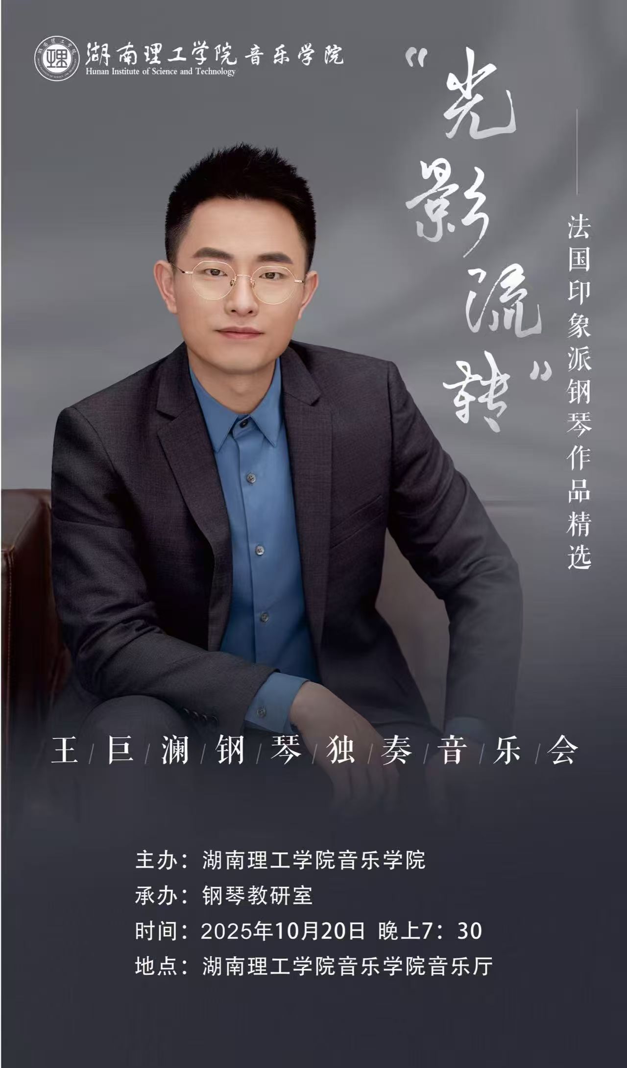 2025年10月20日晚19:30,“光影流转”——王巨澜钢琴独奏音乐会在我院音乐厅顺利举行。本次音乐会由湖南理工学院音乐学院主办、钢琴教研室承办,特邀中央音乐学院钢琴系教师、旅美青年钢琴家、美国辛辛那提大学音乐学院钢琴演奏博士王巨澜登台演奏,学院师生及校外部分钢琴爱好者到场聆听,现场气氛热烈且井然有序。