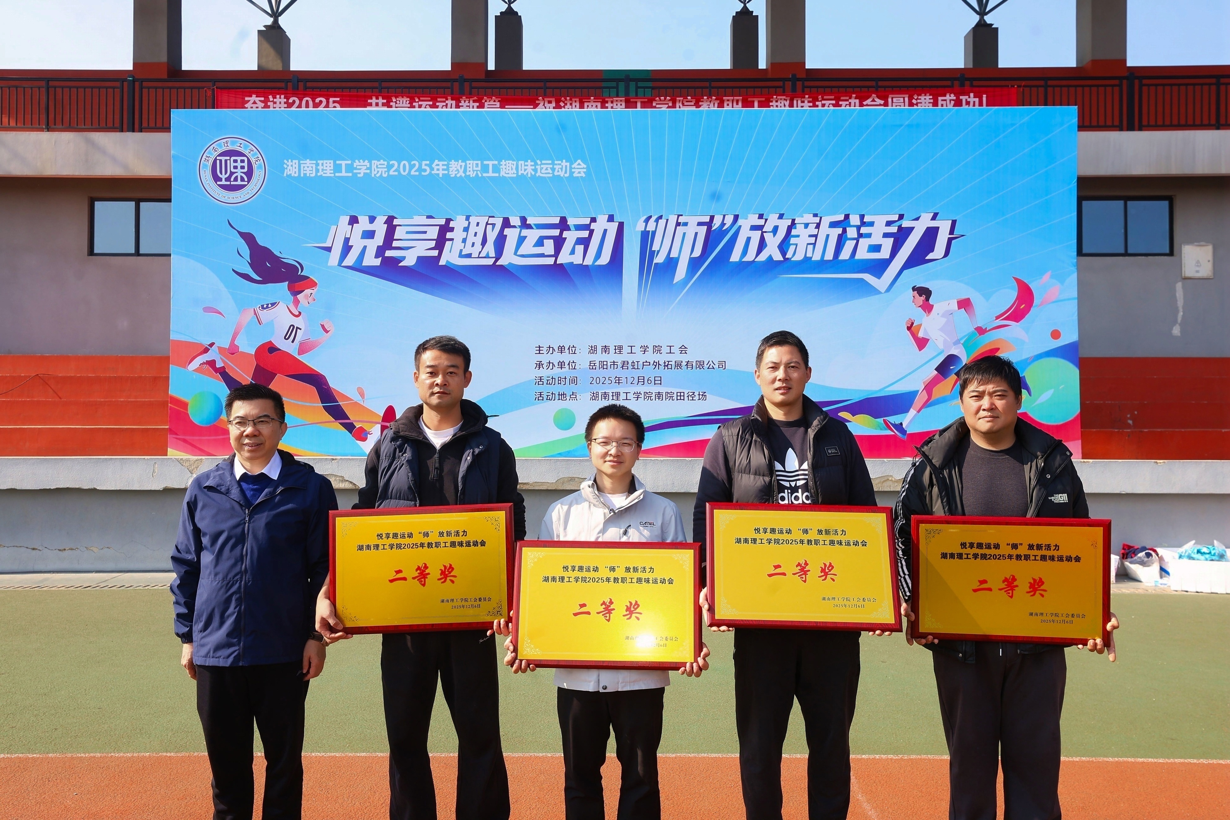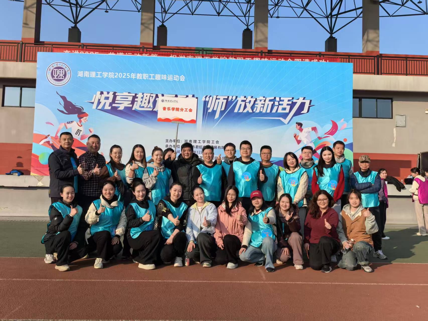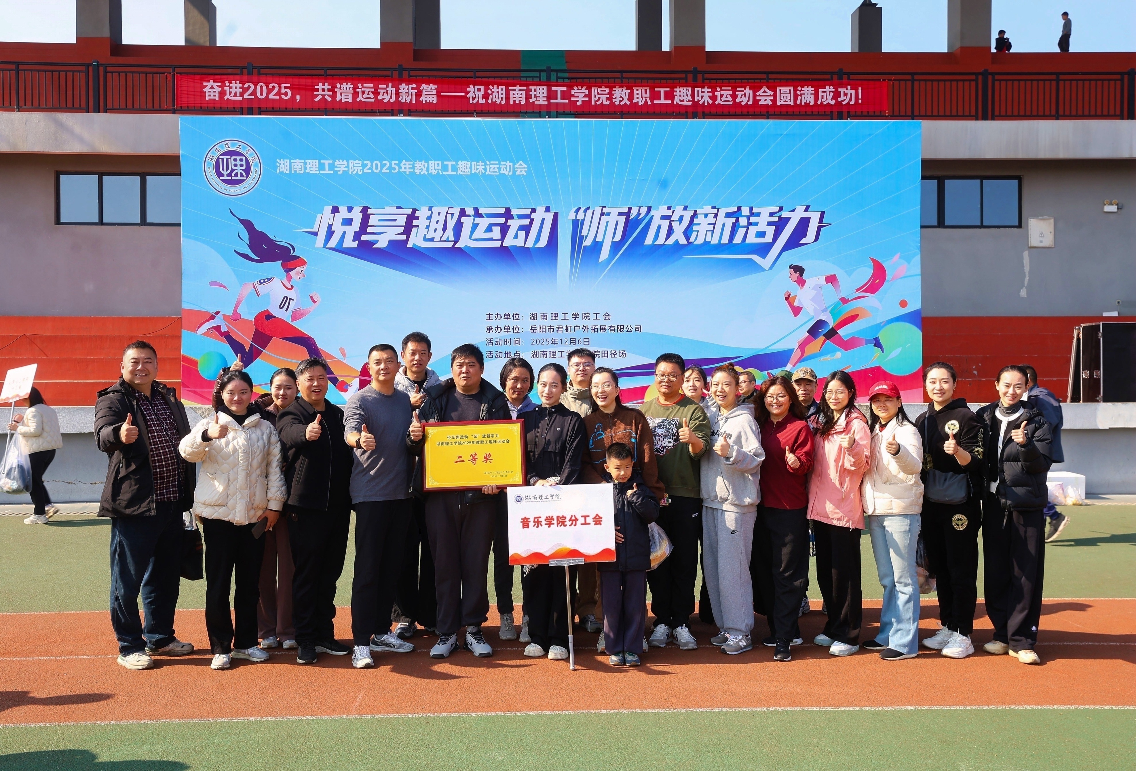 2025年11月6日,湖南理工学院南院田径场上口号嘹亮、活力四射。“悦享趣运动 ‘师’放新活力”2025年教职工趣味运动会在此热烈启幕。全校各分工会教职工齐聚绿茵场,在趣味竞技中释放活力,凝聚团队力量。音乐学院分工会积极响应,精心组织,在“‘音’为热爱,‘体’现精彩”的响亮口号激励下,全体参赛教师团结协作、奋勇拼搏,最终凭借出色的综合表现荣获团体总分第三名,勇夺二等奖,充分展现了学院教职工昂扬向上的精神风貌。