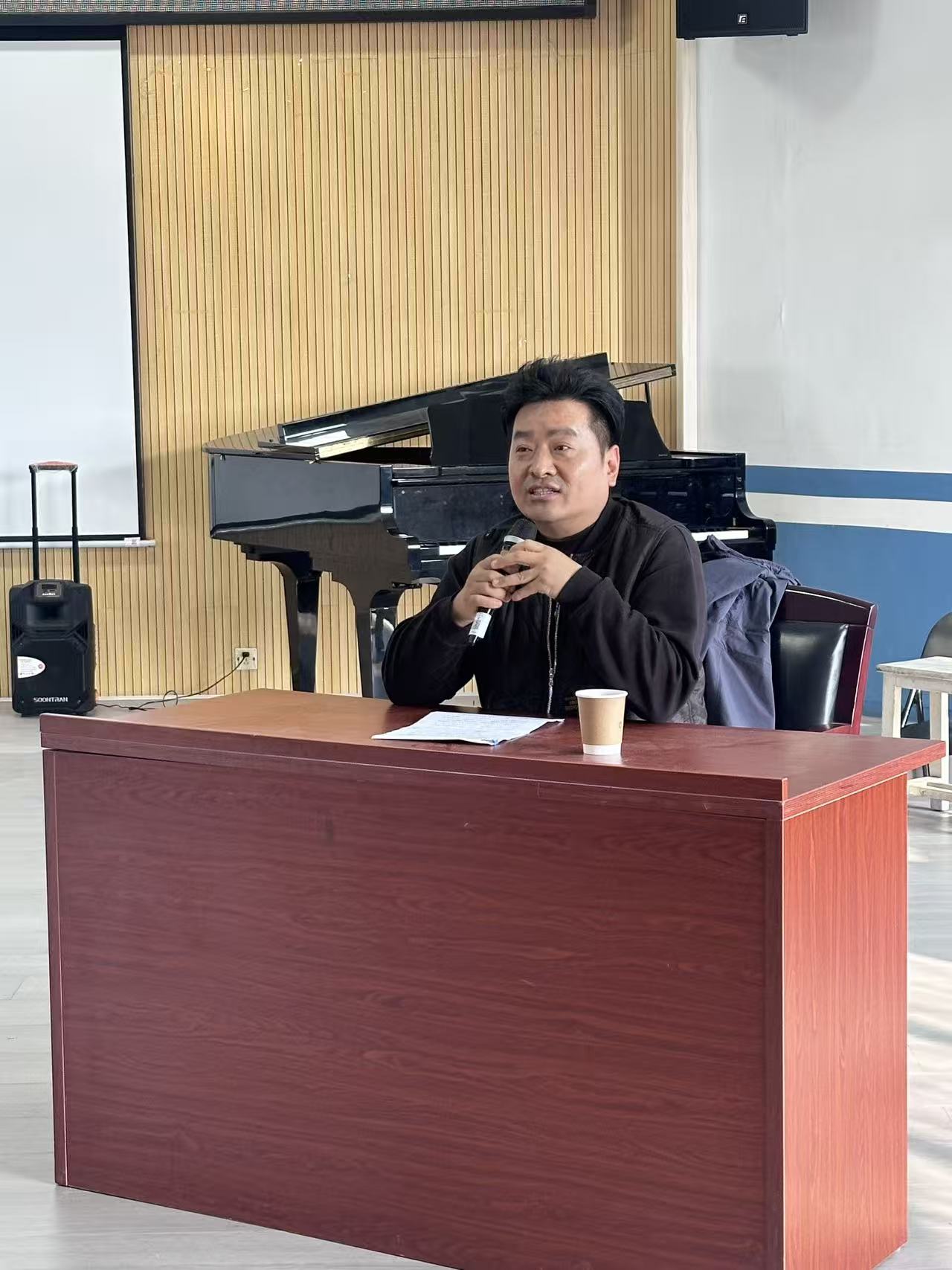 2025年12月18日下午,音乐学院举办“深耕民族声乐的文化根脉”主题讲座,特邀锡伯族青年男高音歌唱家、中央民族大学博士后吴扎拉涛教授主讲,分享其“从演唱实践到理论建构:‘讲台—舞台—案台’三台型育人模式”的探索。作为省级应用特色学科带头人,吴教授结合深厚的学术积淀与生动的实践案例,为师生呈现了一场民族文化与声乐艺术交融的学术盛宴。