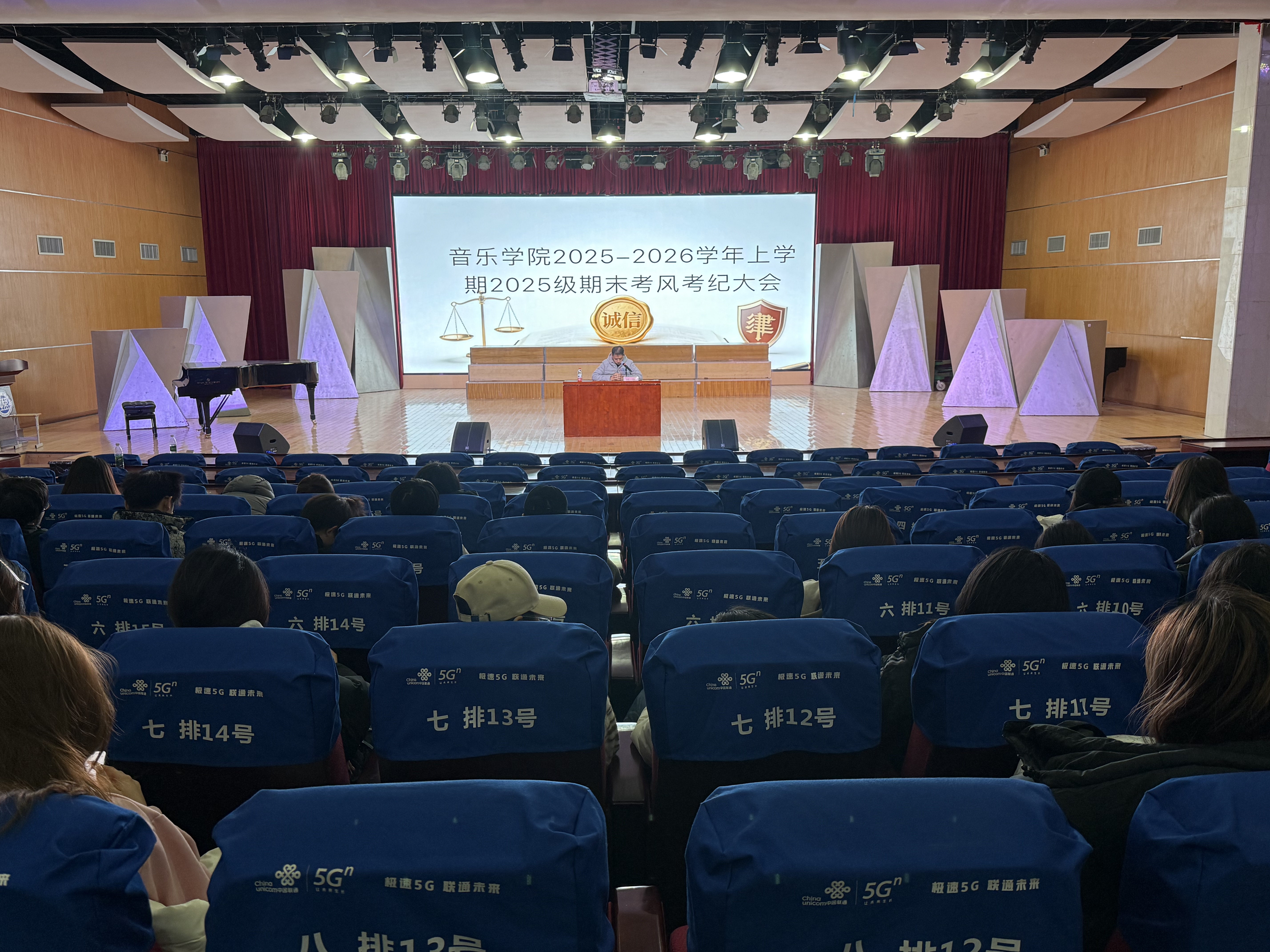 2025年12月25日晚,音乐学院在音乐厅召开2025级学生期末考试考风考纪大会。2025级辅导员孙征出席本次会议,2025级全体学生参加。