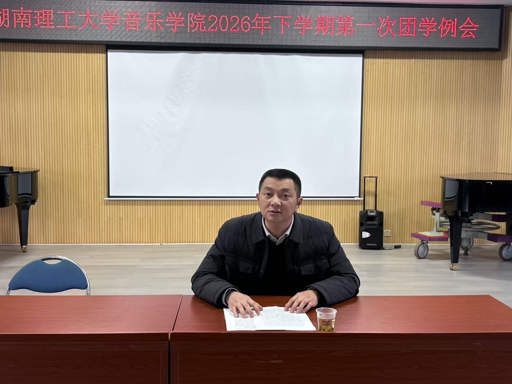 为确保新学期团学工作有序、高效开展,部署本期重点工作,音乐学院于2026年3月18日晚在1T2教室召开了新学期第一次团学工作例会。主持学院党委工作的副书记喻俊、院党委副书记蔡奕、院团委书记李亮菁老师、25级辅导员孙征老师出席会议。本次会议由学院团委学生副书记李乐怡同学主持,全体团学成员参加。