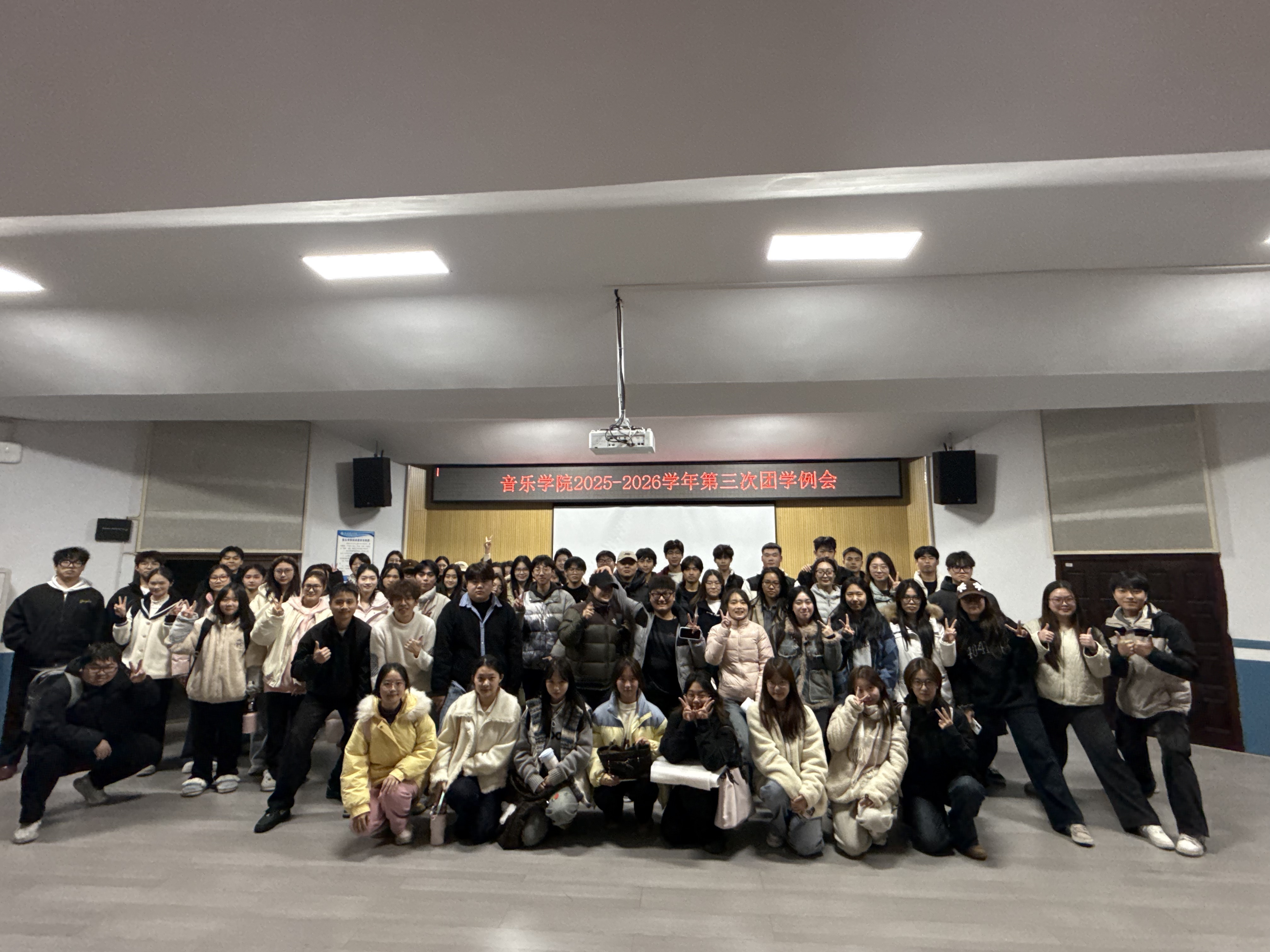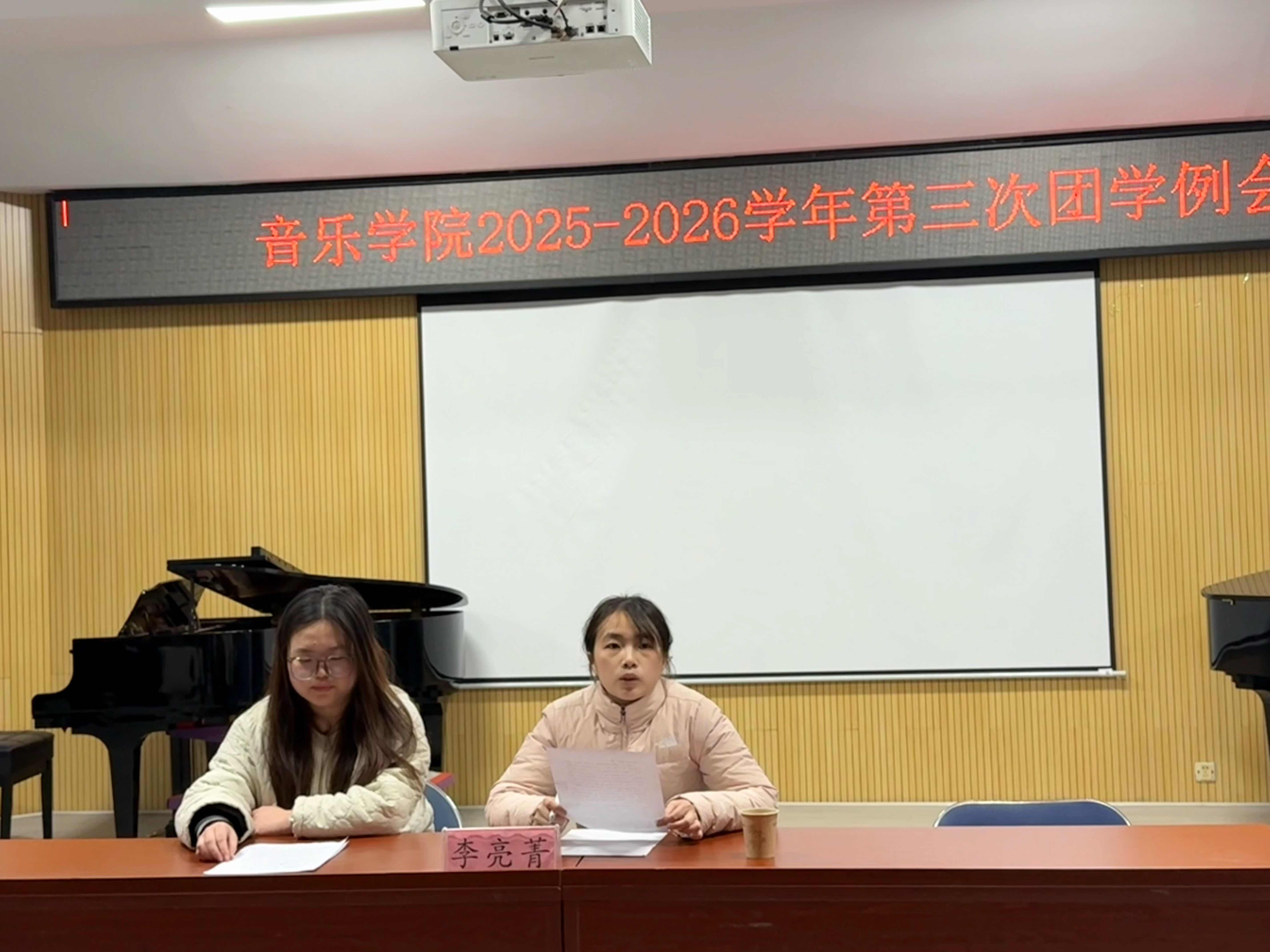 2025年12月16日晚,音乐学院在1T2教室召开期末团学例会,全面总结团学工作,梳理问题,明确下一阶段方向。会议由团委学生副书记朱梓瑶主持,学院团委书记李亮菁及全体团学成员参加。