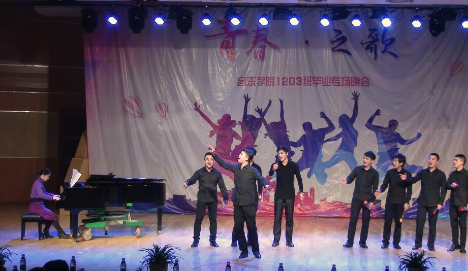 柳青(左一)在学生毕业专场晚会上为学生伴奏